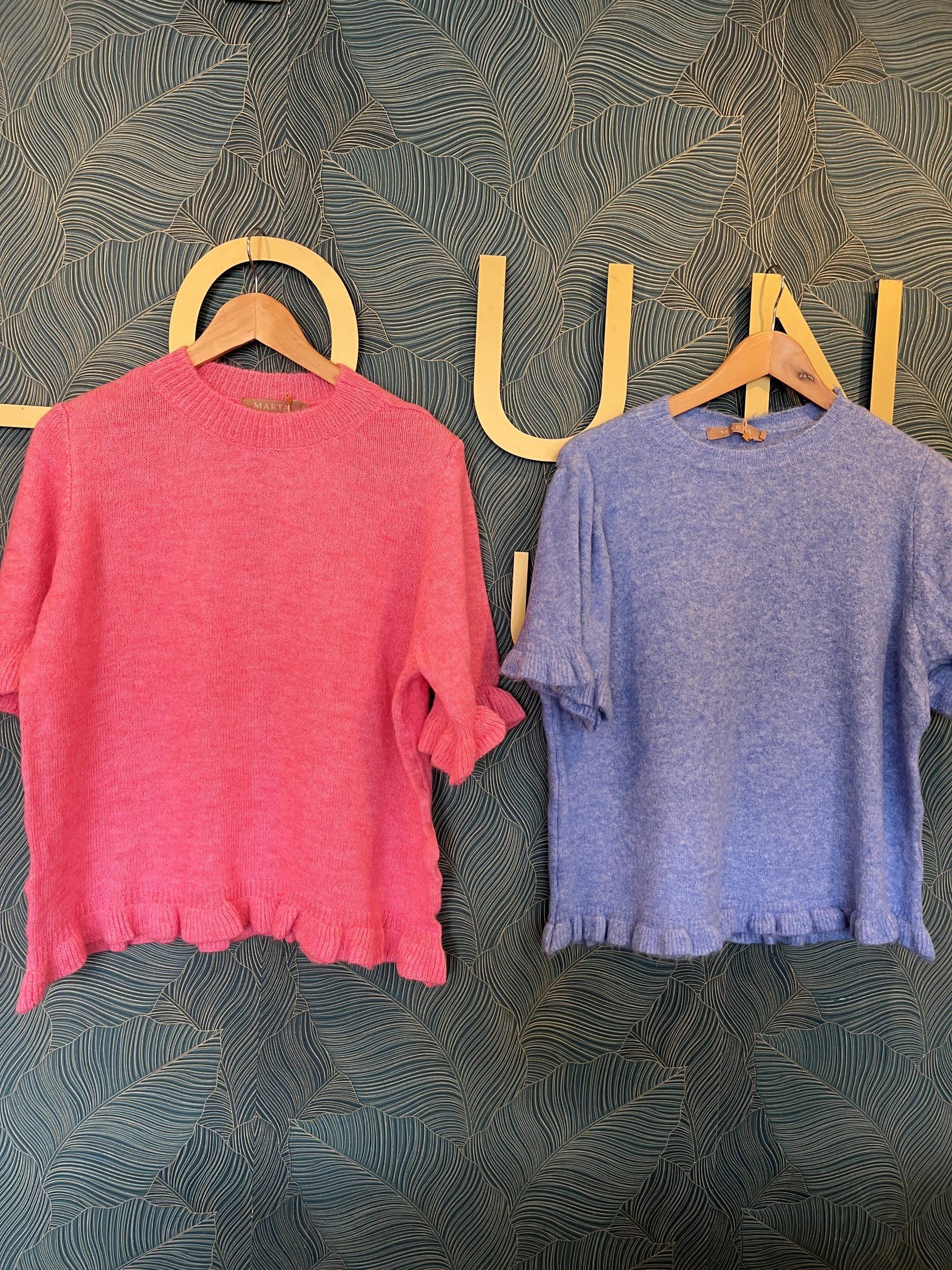 Beautiful short sleeve knit with frill around the sleeve and waist line, looks stunning with jeans or pleated skirt